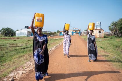 Transformarea Borului prin accesul la apă potabilă Trei prieteni umplu canistre galbene cu apă și se ajută reciproc să le…